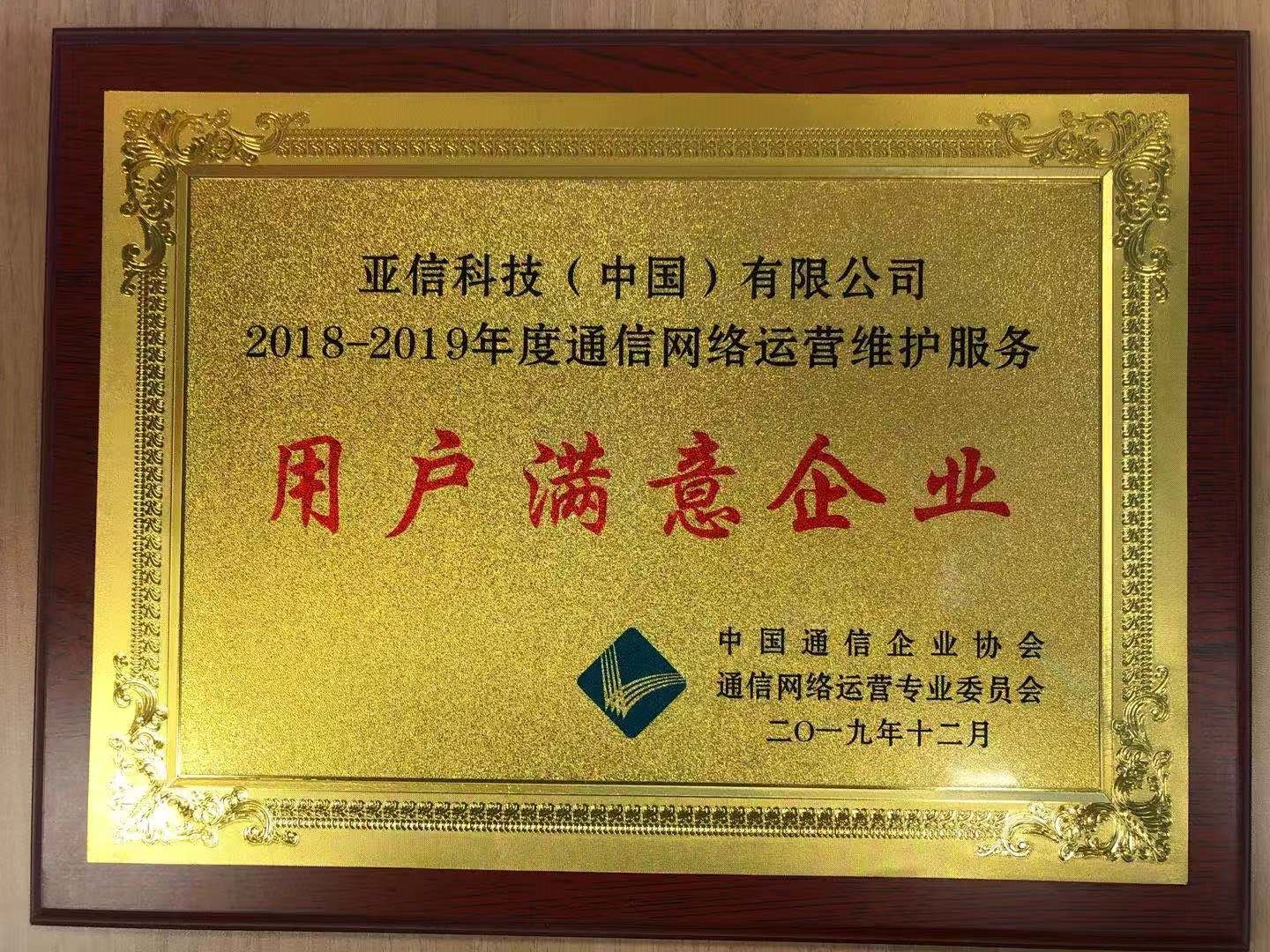 2019年12月 304am永利集团荣获“2018-2019年度通信网络运营维护服务用户满意企业”